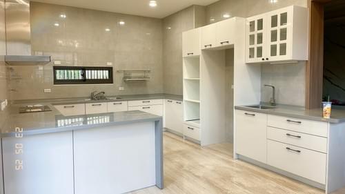 大廚房收納,挑高設計與玻璃門吊櫃,呈現通透大氣之感,檯面落地設計,沉穩厚實美觀。