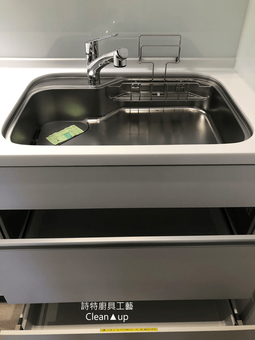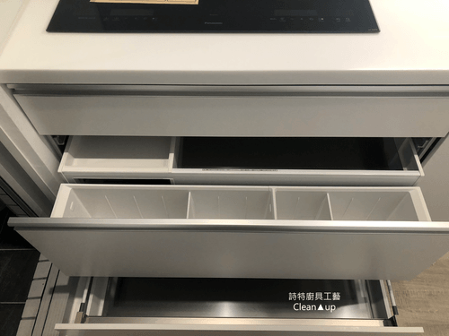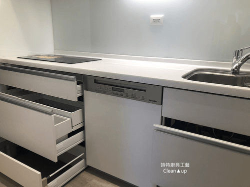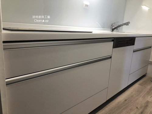 小空間也能有大收納,日式底櫃足元抽和內抽,增加收納空間,搭配下拉式五金吊櫃,好收又好拿,白色門片與壁面玻璃搭配感應式廚下燈,降低梁柱壓迫感也易於清潔。