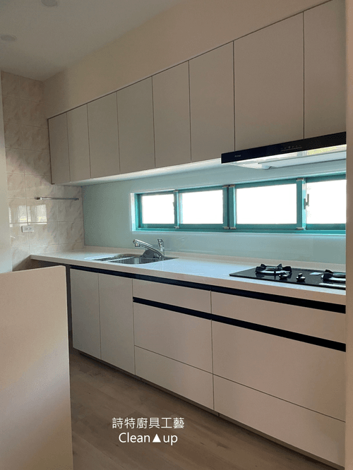 日本原裝櫥櫃,白色門板搭配黑色崁入式把手,線條簡潔俐落。