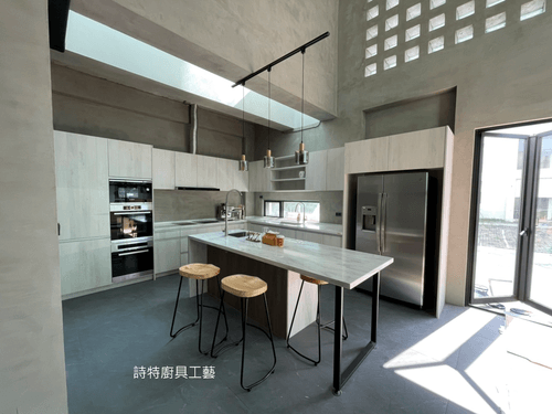 吊櫃層板增加展示空間,崁入式電器與炊飯鍋收納櫃收納電器更簡潔,中島檯面側落,加強檯面支撐更顯大氣,雙水槽搭配,廚房動線分流更有效率。