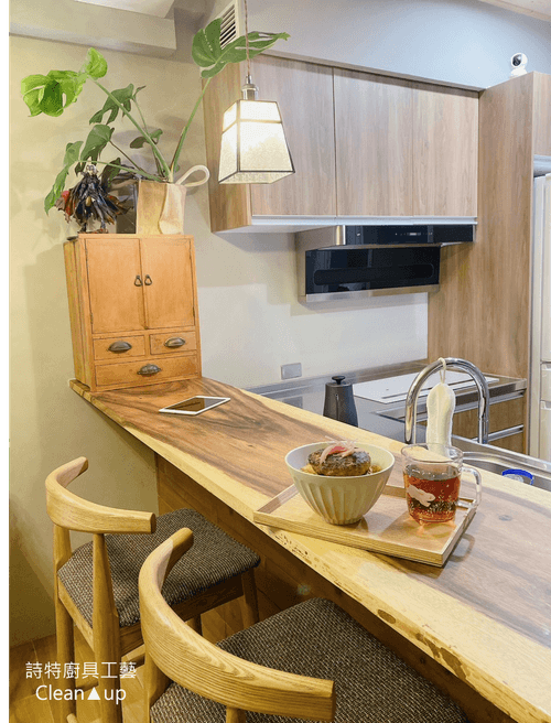 木質色調開放式廚房呈現溫暖質感,烹煮時亦能與客廳家庭成員互動,讓廚房成為交流中心。