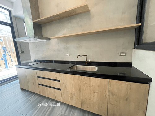 層板取代吊櫃收納,擴大空間感,一字型操作空間,保留備餐與檯面收納,造型龍頭為廚房增添獨特風格,讓烹飪變得更加愉悅。